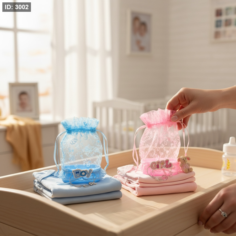 توزيعة أنيقة ومميزة لمناسبات المواليد، بتصميم لطيف وألوان ناعمة (زهري للبنات وأزرق للأولاد).