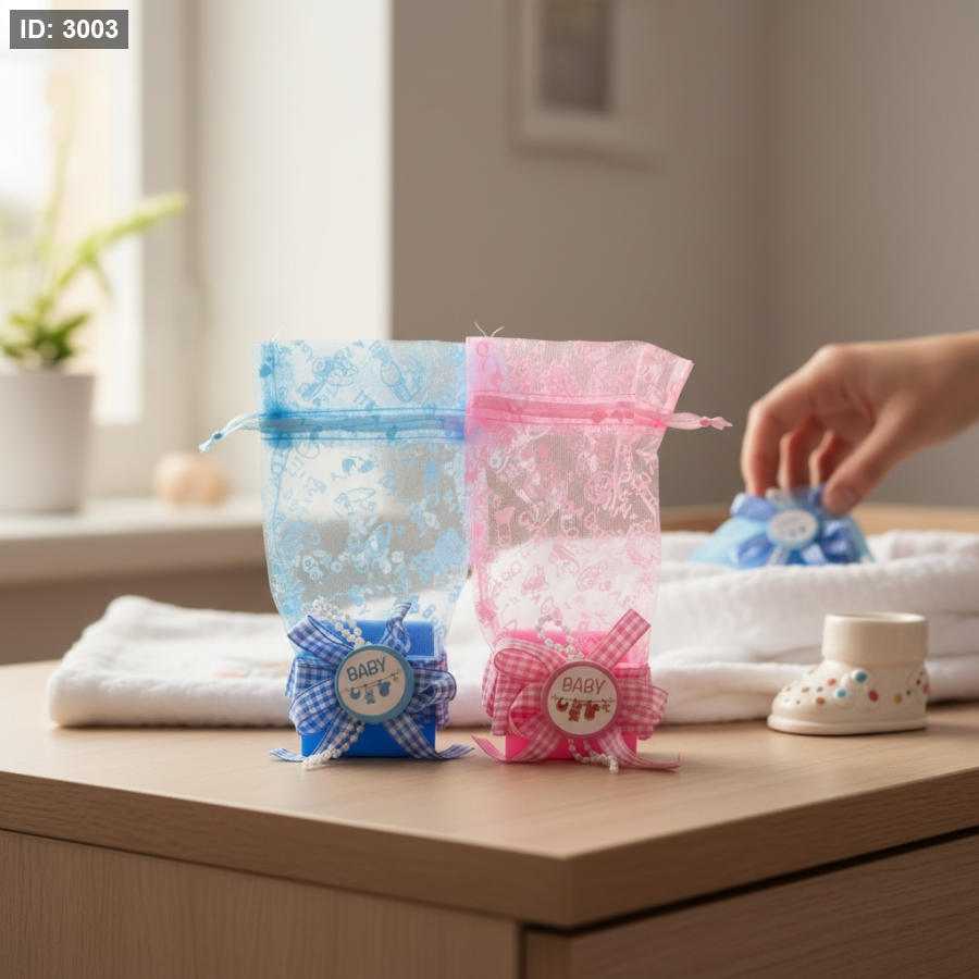 توزيعة أنيقة ومميزة لمناسبات المواليد، بتصميم لطيف وألوان ناعمة (زهري للبنات وأزرق للأولاد).