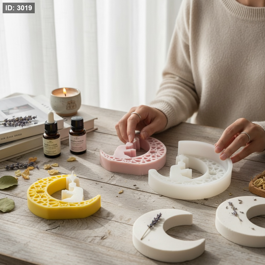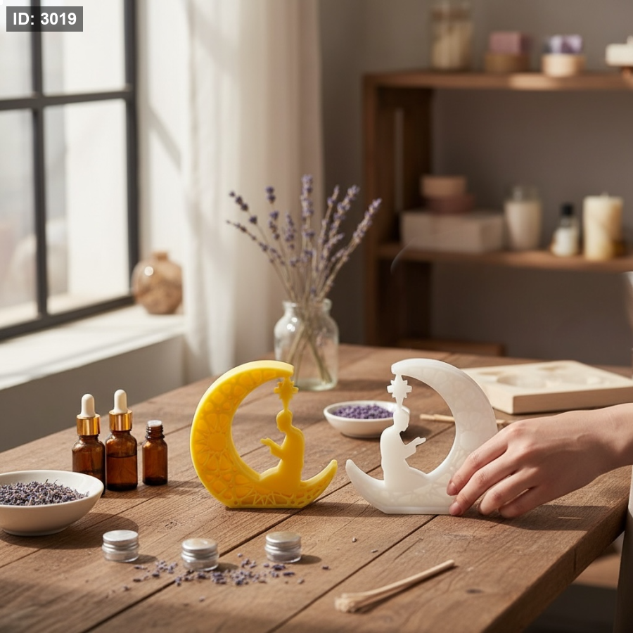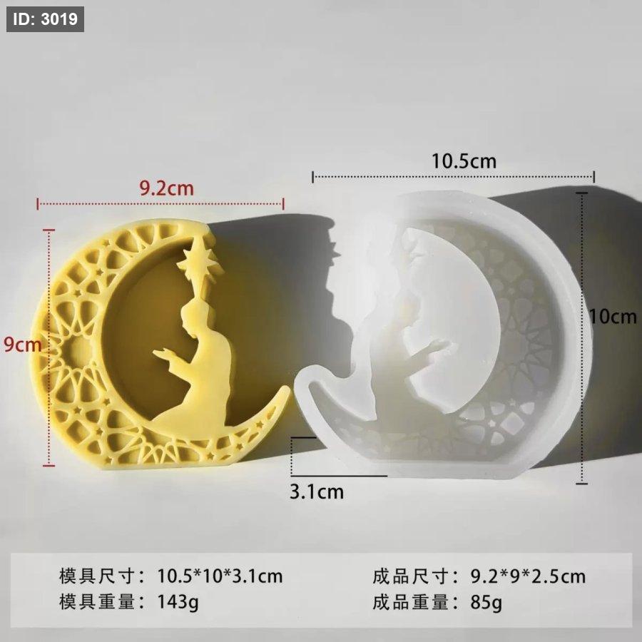 قالب فريد يجمع بين زخارف "الأرابيسك" الهندسية على جسم الهلال، مع تجويف فني يجسد شخصاً في وضعية التضرع والصلاة تحت نجمة مضيئة.
