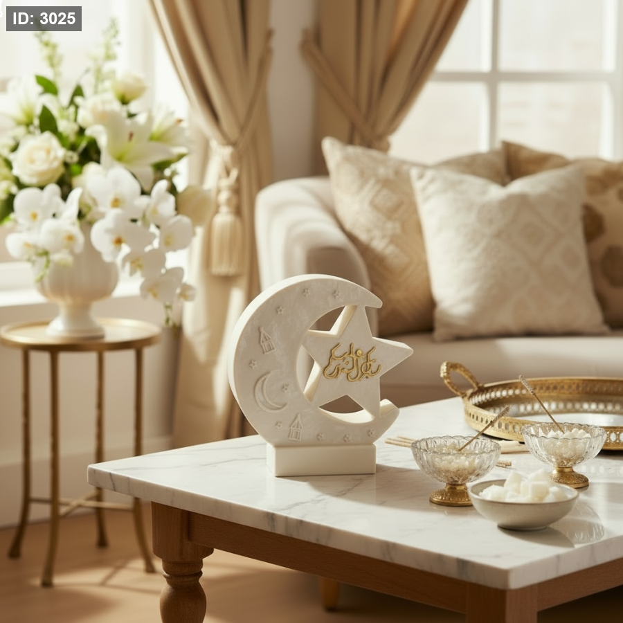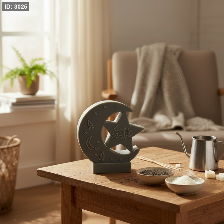 نقوش تراثية دقيقة للهلال والنجمة مزينان بنقوش بارزة تضم كلمات بالخط العربي وزخارف إسلامية (مساجد وفوانيس) تضفي لمسة من العراقة مع وجود قاعدة مدمجة وقوية